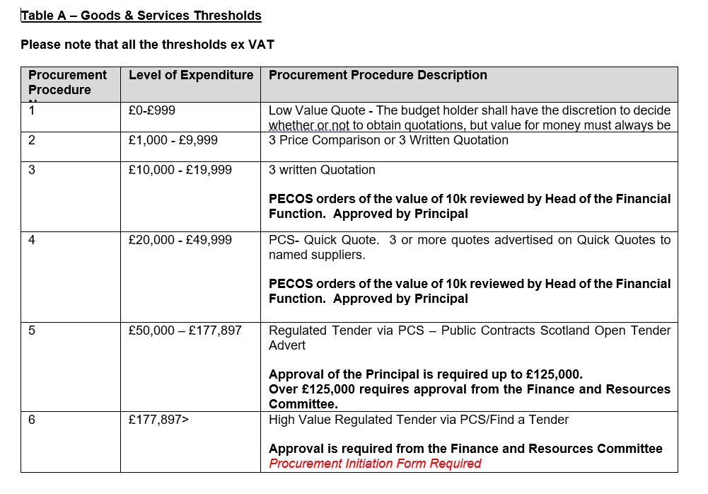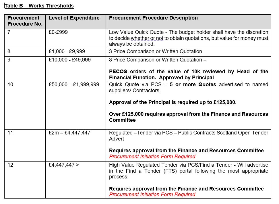 When established agreements are not available, we procure through competitive tendering, using Public Contracts Scotland (PCS or PCS-Tender), ensuring compliance with the following thresholds: