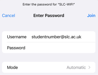 Username - your pc username (studentnumber@slc.ac.uk)