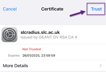 - If you have an Apple device, select “Trust” when your shown the certificate screen.